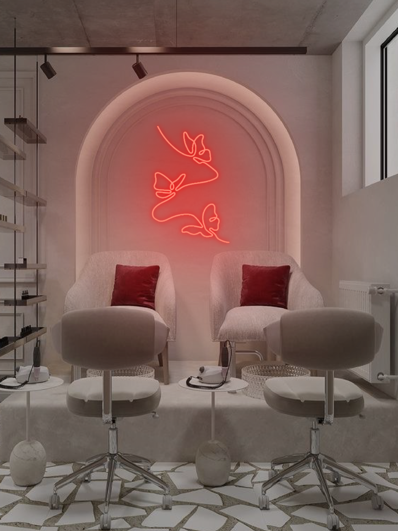 Linie neonowych motylków unoszą się lekko na ścianie, nadając przestrzeni radosny, artystyczny charakter. Idealny do pokoju, sypialni czy garderoby, tworzy przytulną, inspirującą atmosferę pełną delikatnego uroku i elegancji.